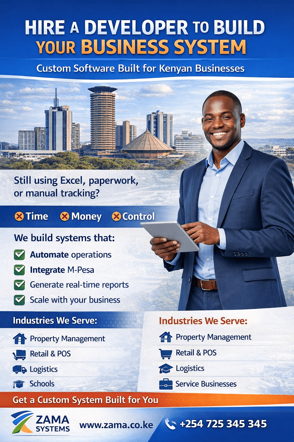 At Zama Systems LTD, we design and develop custom business systems in Kenya that automate workflows, integrate M-Pesa, and give you full control of your operations.