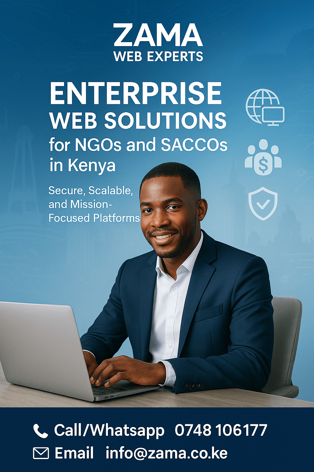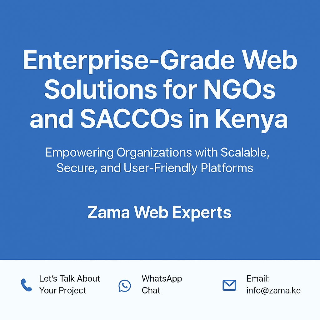 Zama Web Experts is a leading provider of NGO website development services in Kenya. We build secure, modern, and scalable websites and web portals tailored for nonprofits, SACCOs, government projects, and high-impact institutions.